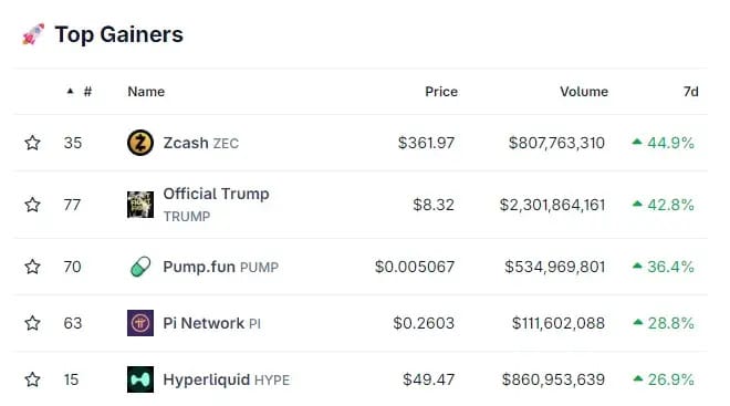 ⬆️ZCash (ZEC) +51% ⬆️Pump.fun (PUMP) +45% ⬆️Official Trump (TRUMP) +44%