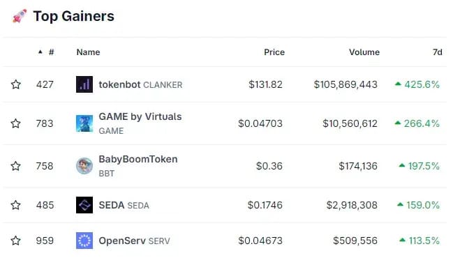 ⬆️tokenbot (CLANKER) +432% ⬆️GAME by Virtuals (GAME) +256%
