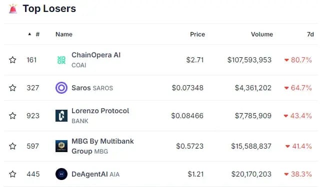 🔻ChainOpera AI (COAI) -81% 🔻Saros (SAROS) -63% 🔻AI Companions (AIC) -35%