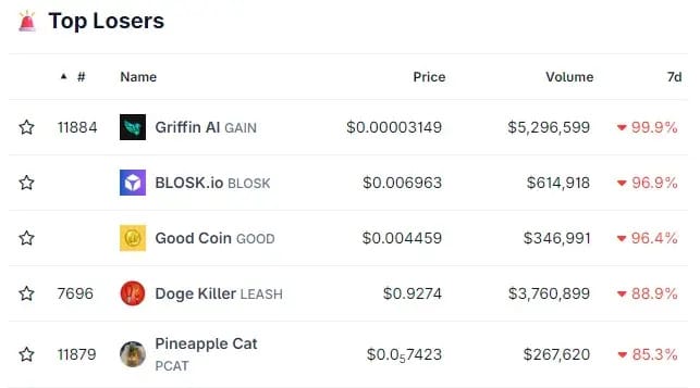 🔻Griffin AI (GAIN) -99% 🔻BLOSK.io (BLOSK) -96%