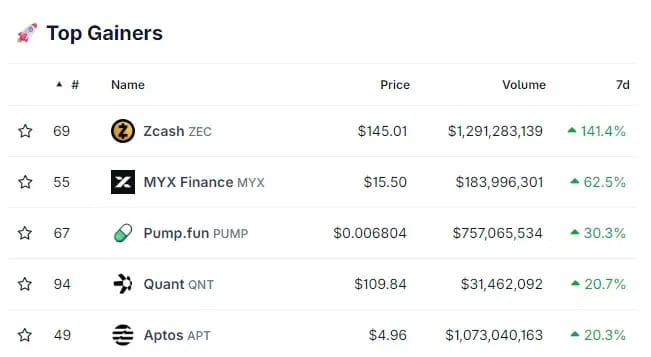 Zcash led the charge, spiking 40% and climbing the rankings.